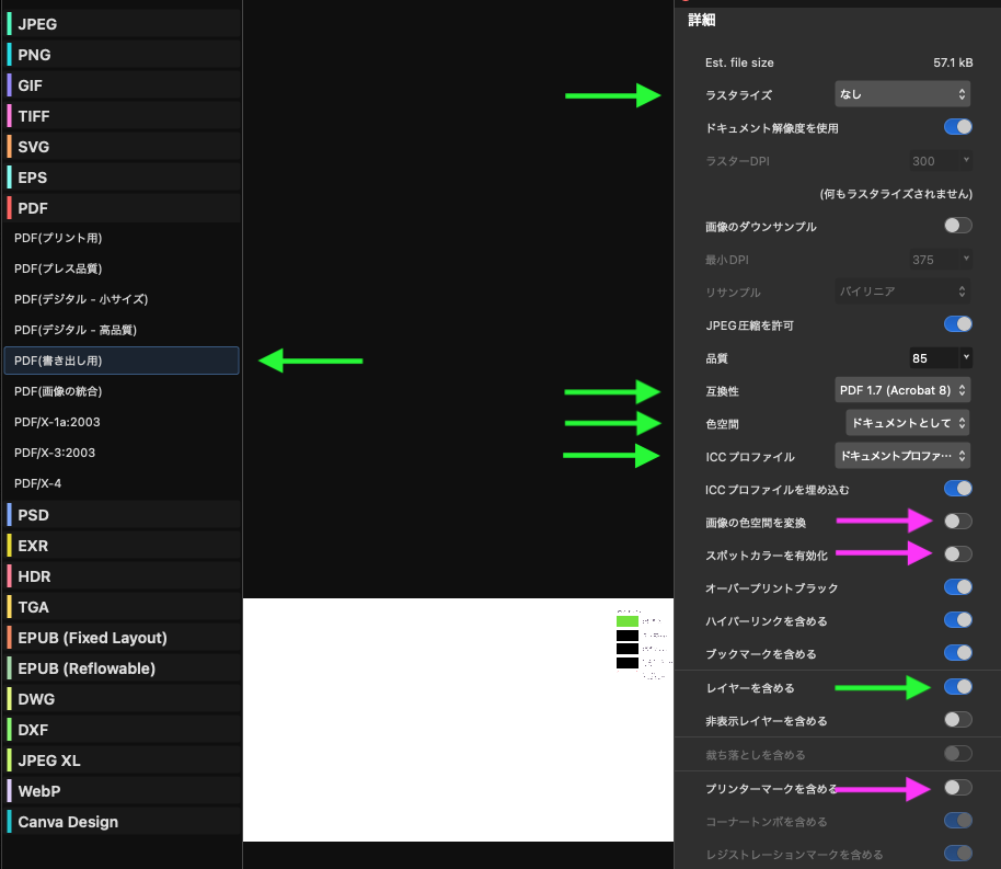 - 左側で 「PDF」→「PDF(書き出し用)」 を選択